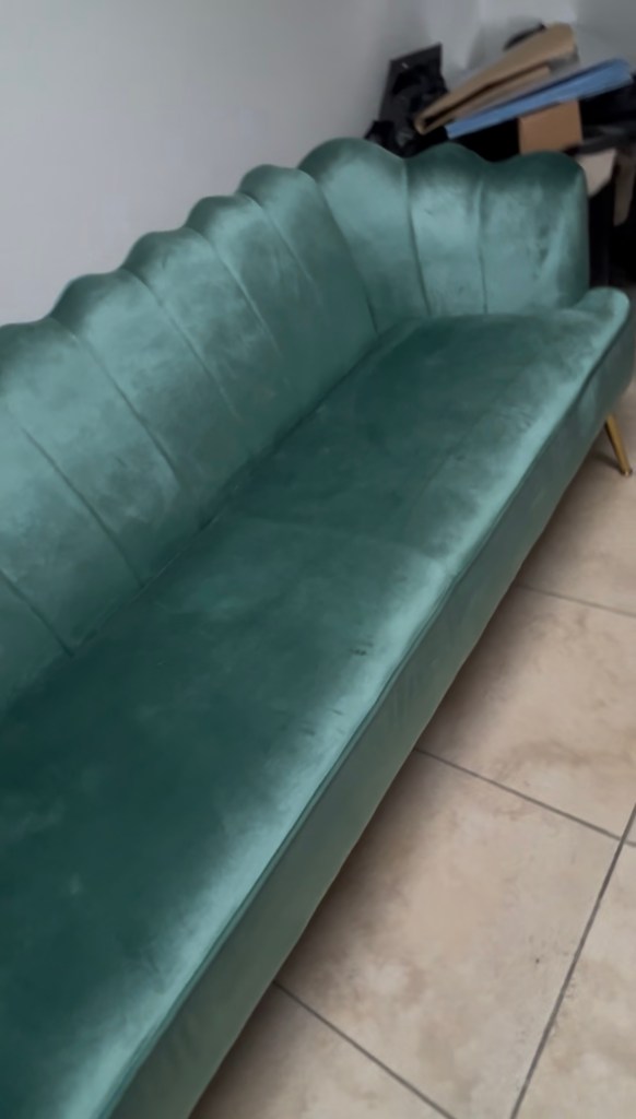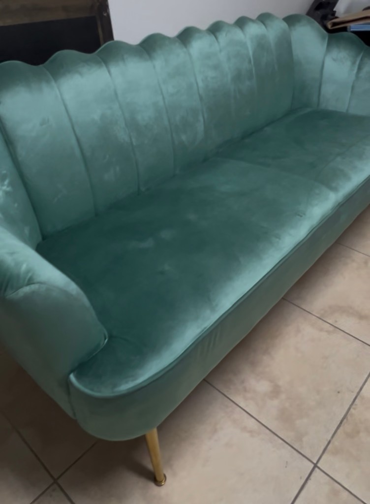 This piece features a scalloped back and velvet material. It is used but in great condition. This would be a lovely addition to a home, office, spa, or boutique. The picture with the living room decor is the original product picture. The sofa was originally purchased for over $500. See link below. https://www.wayfair.com/furniture/pdp/mercer41-conesha-velvet-flared-arm-sofa-convertible-sofa-modern-sofa-living-room-sofa-w004733681.html?piid=476414533